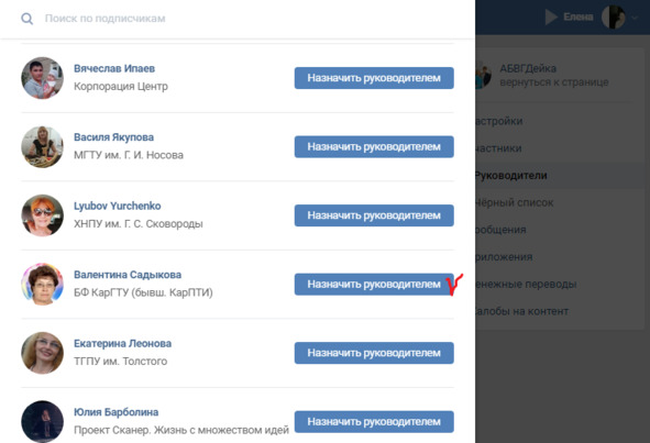 Перед вами появится список с участниками. Выбираем нужного участника и около него кликаем Назначить руководителем.