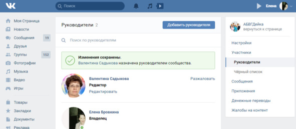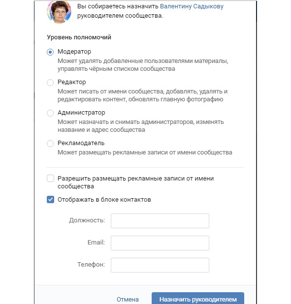 И здесь мы выбираем кем этот человек будет в сообществе. Нажимаем назначить руководителем. Себя обязательно назначьте Администратором.