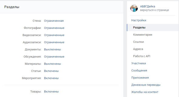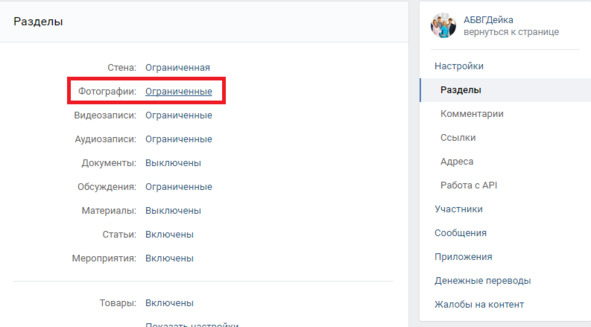Далее кликаем Настройки. Разделы. Фотографии. Выбираем Ограниченные.