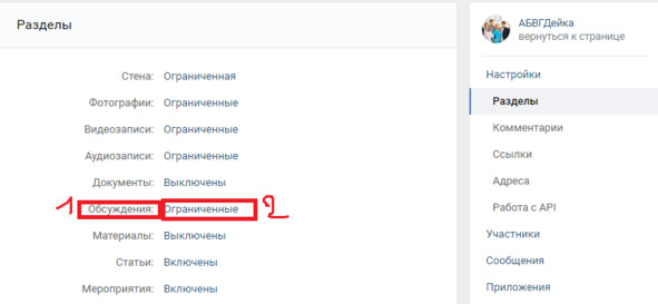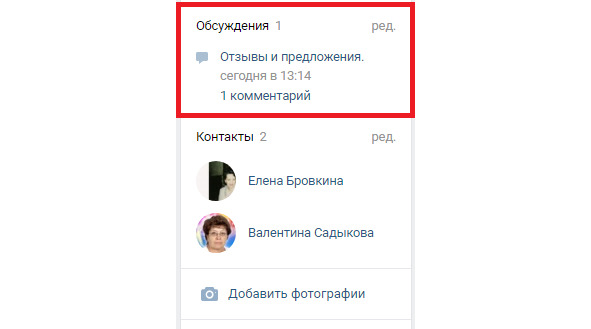 Теперь заходим в группу и мы видим раздел обсуждение. Кликаем на него.