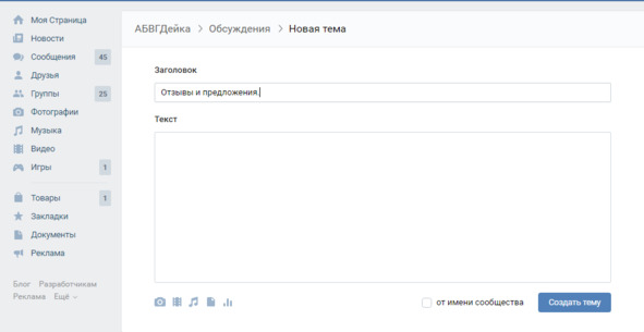 Ставим чикбокс От имени сообщества и кликаем создать тему.