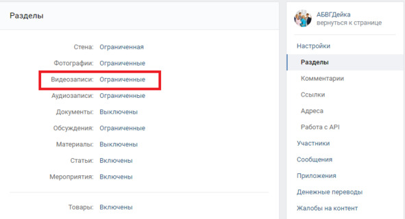 Выбираем настройки. Разделы. Видеозаписи. Ставим Ограниченные.