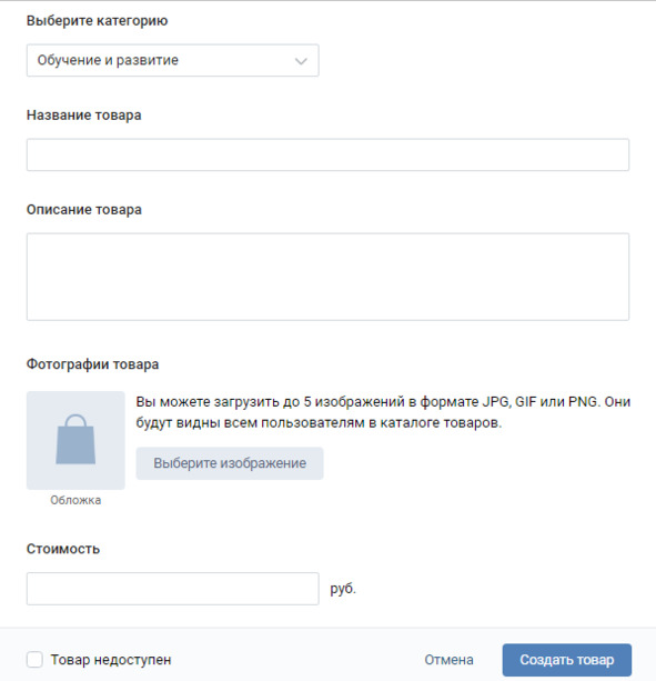 Далее мы указываем категорию, название товара, делаем описание, вставляем обложку и ставим стоимость.