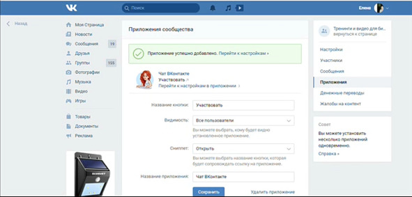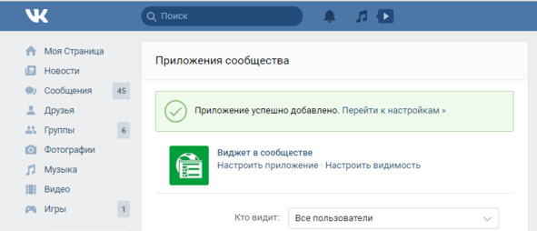 Мы попадаем вот на такую страничку, где написано, что приложение успешно добавлено и Можно перейти к настройкам.