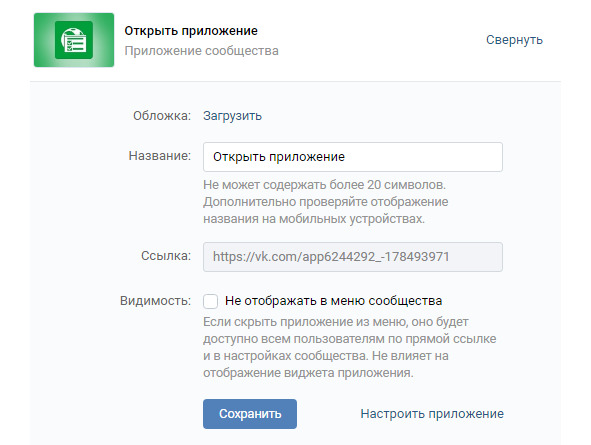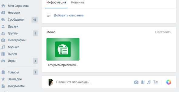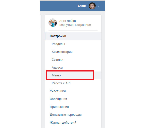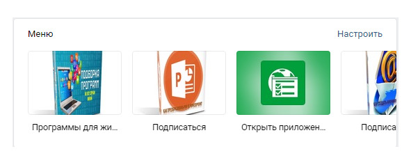 Затем заходим в свою группу. Раздел Меню. Кликаем Настроить и загружаем в обложку нашу сохраненную кнопочку.
