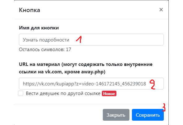В первом поле мы пишем текст для своей кнопочки. Вставляем ссылку на свою бесплатность в Гамаюн во второе поле и кликаем Сохранить.