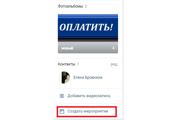 2 способ. Если Вы хотите оформить мероприятие от своей группы, то заходим в нее. В самом низу с лева кликаем Создать мероприятие.