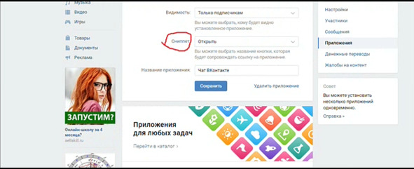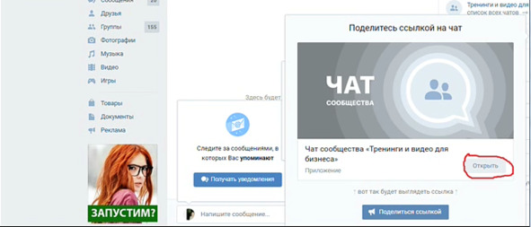 Откроется в посте, когда Вы будите рассказывать о своем чате на своей странице Вконтакте, а также с своей группе. Оно будет отображаться кнопочкой Открыть.