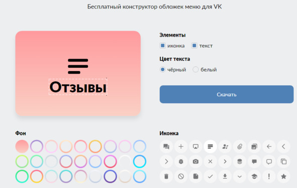 В элементах есть Иконка и Текст. Цвет текста: черный и белый. Можно выбрать любой фон. Поменять цвет. Готовую иконку скачиваем в отдельную папочку.