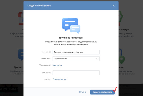 Адрес указывается, если оно проводится в офлайн и кликаем Создать сообщество.