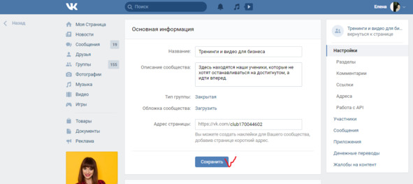 Попадаем на страничку, где нужно заполнить основную информацию: даем название сообществу, описание, и т. д. Затем нажимаем Сохранить.
