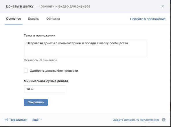 Кликаем Основное. Здесь мы можем изменить текст и поставить чикбокс около записи Одобрять донаты без проверки.