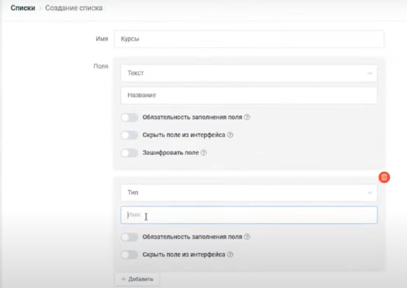 Даю название, выбираю тип текст и добавляю нужные поля: