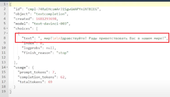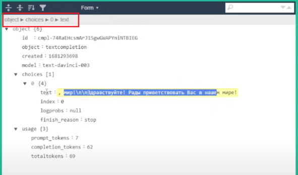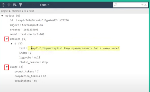 Если перейду в режим Form, то здесь увижу какое количество токенов использовано для вопроса, для ответа. Здесь так же увижу ответ от искусственного интеллекта, который могу получить: