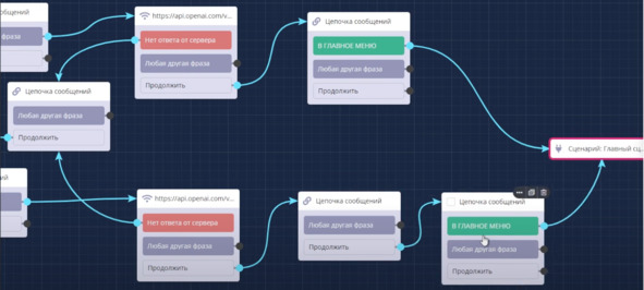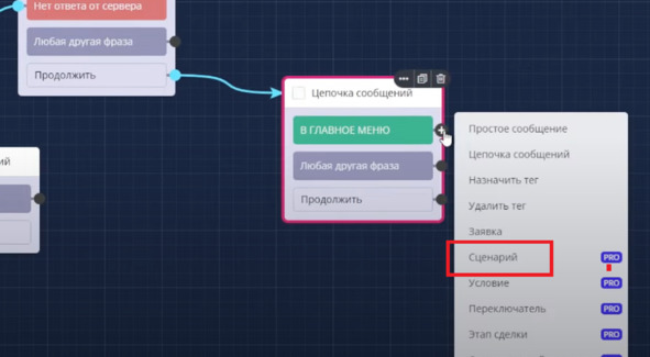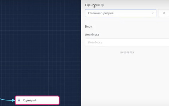 На этом блоке могу сделать кнопку Главное меню и соединить ее с главным блоком, а чтобы не запутаться, могу добавить кнопку Сценарий: