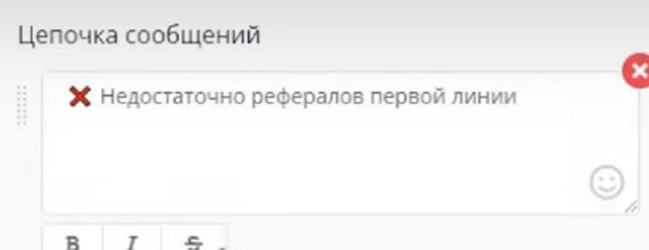В блоке созам кнопку Получить бонус, сделаю ее инлайн. Направлю на блок Условия, который будет проверять, имеет ли контакт, который кликает эту кнопку определенное количество рефералов, к примеру, 1: