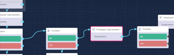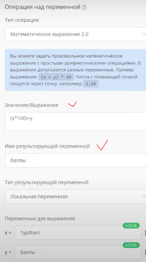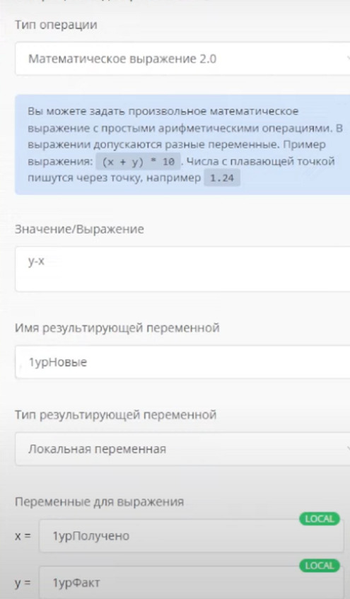 После блока Условие, который проверяет наличие тега, он направит по ветке Да. Я могу сделать такую проверку. Добавлю блок Операция над переменной, выберу математическое выражение 2.0. Добавлю локальную переменную, которая называется 1 уровень получено, а также возьму еще 1 локальную переменную фактическое количество рефералов и сделаю вычисление: