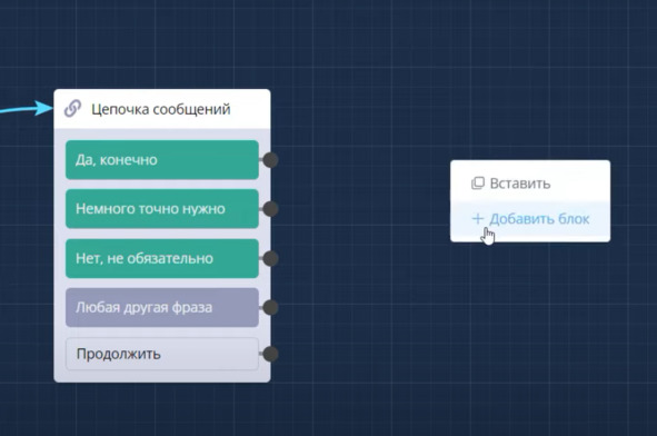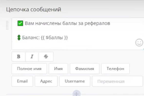 После этого можно добавить блок Цепочка сообщений, где сообщаем о начислении баллов: