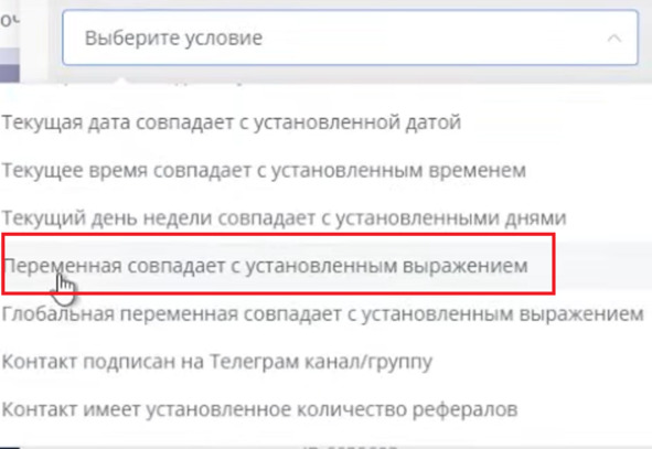 Для этого я после кнопки начать создам блок Условие и выбираю условие:
