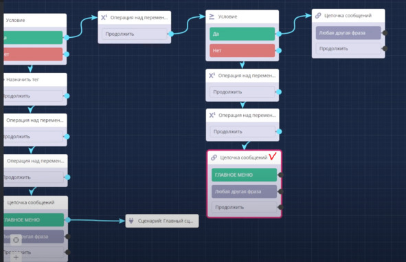 Таким образом бот будет знать новое количество рефералов и данное число умножать на 100 и прибавлять к новым баллам. После всех этих вычислений я также буду использовать блок Операция над переменной, в которой формируется переменная получен 1 уровень с текущим количеством всех рефералов.