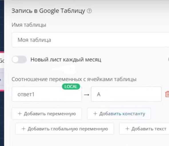 Ответы сохраняем в Гугл – таблицу. Добавляем Блок: