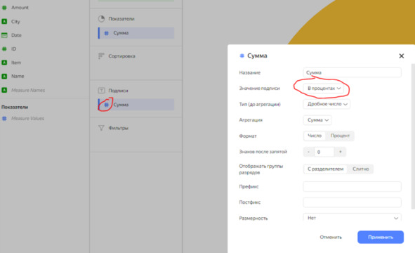 Вместо простой суммы продаж на отчете, будем отображать процентное соотношение
