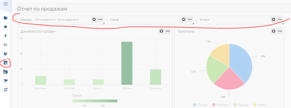 Сейчас произведите объединение всех трех отчетов на одной дашборд-панели. Создаем пустую рабочую область, а также добавим 3 фильтра, которые будут использоваться для отбора и фильтрации значений: фильтр по дате, фильтр по городу, а также фильтр по категориям. Все данные сведения также будут браться из первоначального набора данных, который мы создали вначале.