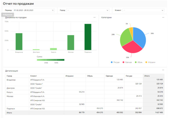 Таким же образом добавим на рабочую область 3 наших графика. Выровняем их. Уберем рабочее название дашборд, а также сформируем привлекательный заголовок. Теперь наш отчет готов. Теперь воспользуемся фильтрами, а также проанализируем значения. В феврале наибольшие реализации были в Подольске.