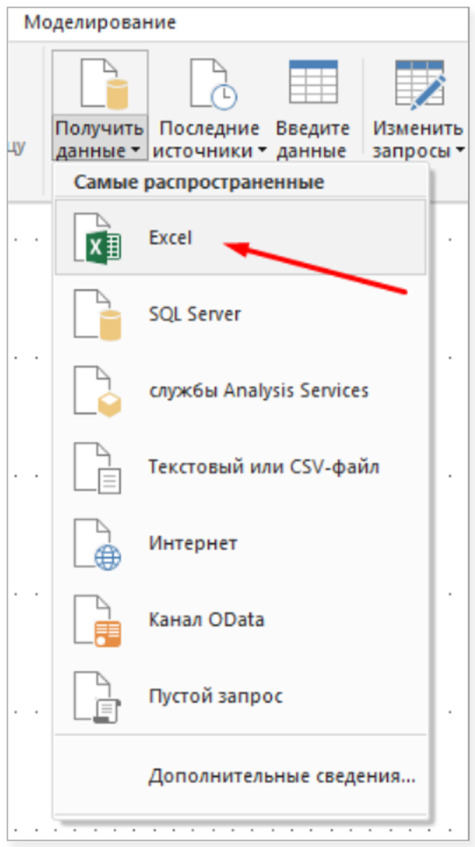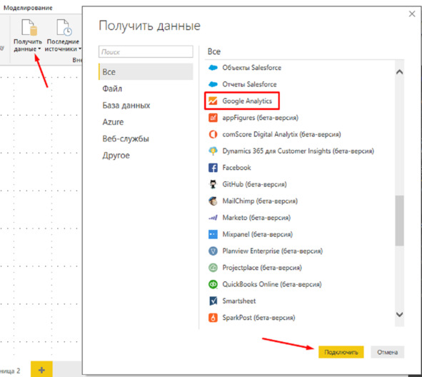 Для подключения к счетчику Google Analytics из Power BI надо применять соответствующий коннектор. Кликните на Получить данные, затем выберите Дополнительные сведения, а также найдите необходимый коннектор среди предложенных вариантов.