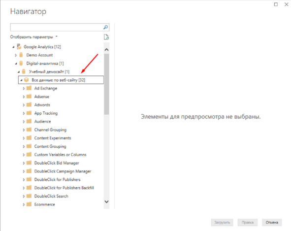 Выбираем необходимый источник сведений, к примеру, Google Analytics.