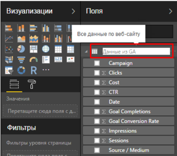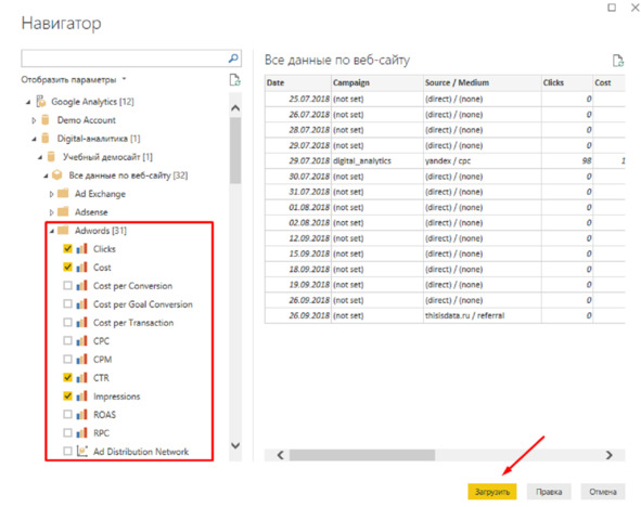 Для создания отчета необходимо подключиться к коннекторам Google Analytics или Яндекс Директ. Если выбирается Google Analytics, все метрики будут легко доступны. Однако, при использовании Яндекс Директ требуется сторонний коннектор или скачивание данных в Excel таблицу из рекламного кабинета и их импорт в Power BI.