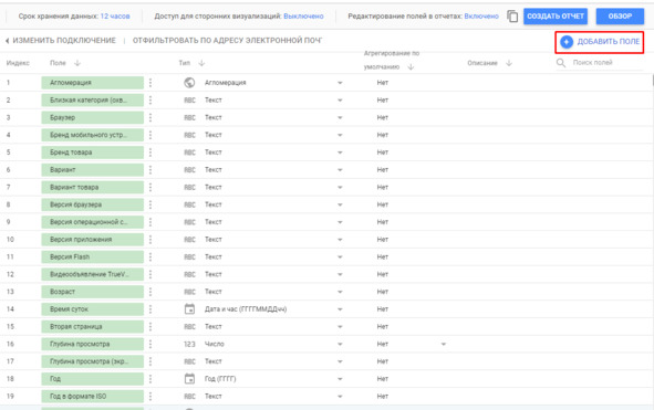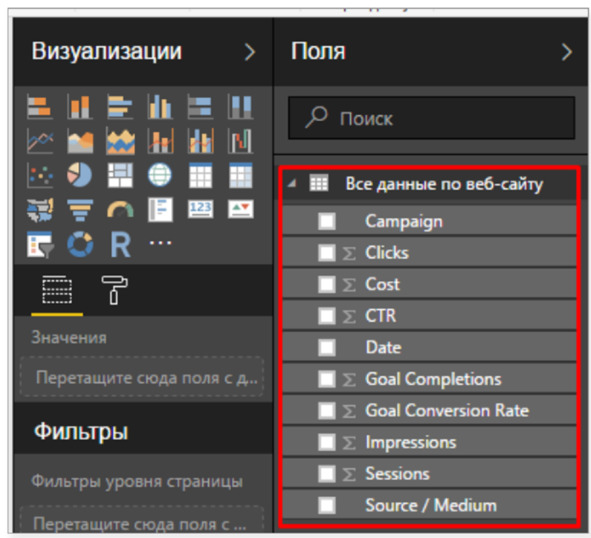 Затем перечень загруженных параметров, а также показателей в колонке Поля.