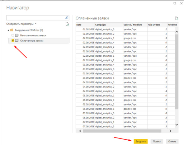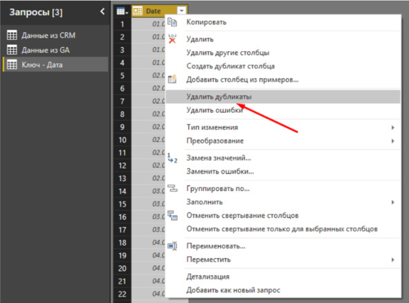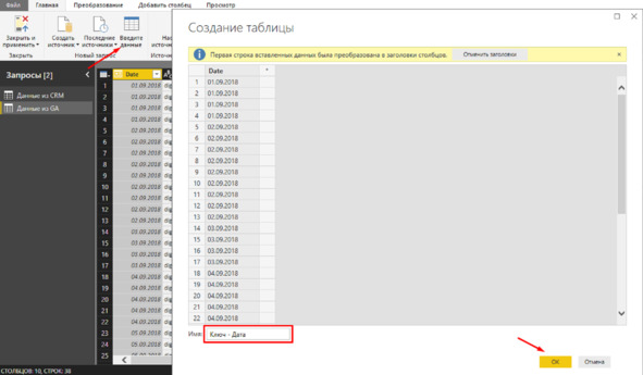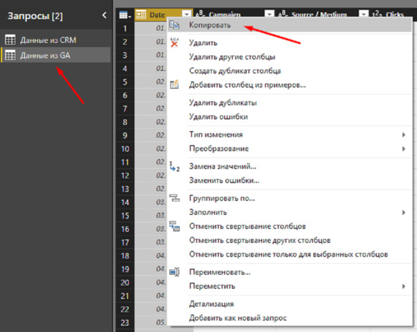 Для данного перейдите в редактор запросов, выберите источник сведений из Google Analytics, а также скопируйте 1 столбец с датами.