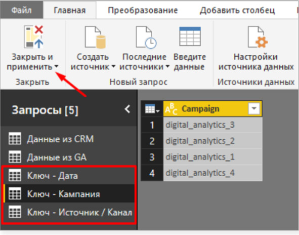 После этого необходимо сформировать аналогичные таблицы для ключей Source/Medium, а также Campaign. После выполнения этих действий, нажмите Закрыть и применить.