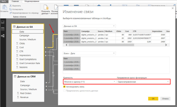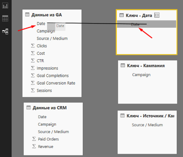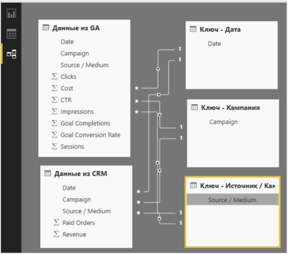 Остается завершающий шаг – связать два запроса с помощью ключей, чтобы приобрести модель сведений для построения отчета.