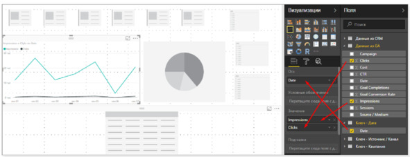 После выполнения всех этих действий, можно добавить сведения на визуальные компоненты отчета. Выберите график, перетащите ключ Дата из источника Ключ – Дата в раздел Ось, а сведения Impressions, а также Clicks из источника "Данные из Google Analytics в раздел Значение.