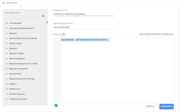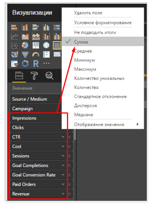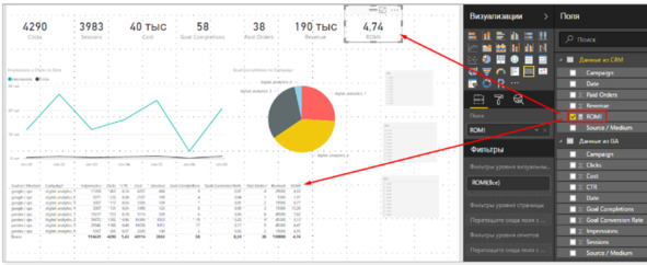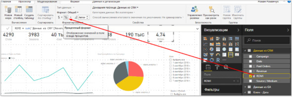 Также добавьте рассчитываемый показатель ROMI (возвращение рекламных вложений) как новую меру в отчете.