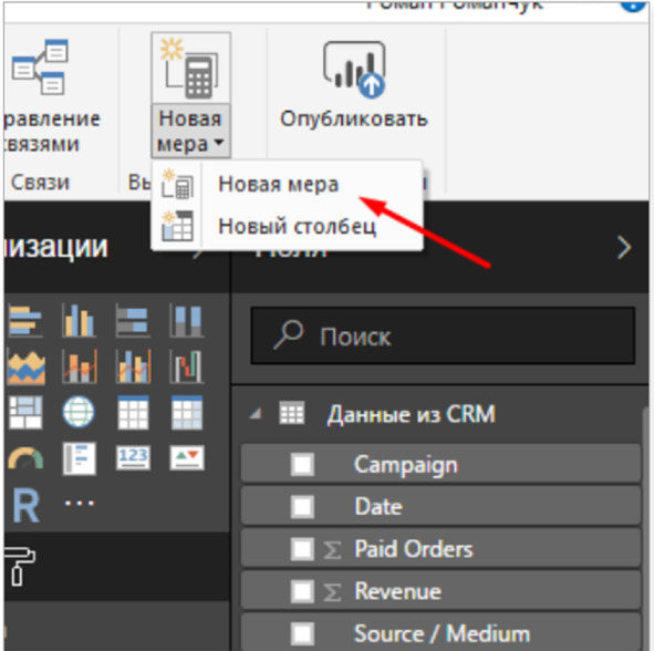 Для данного выберите Новая мера и пишем формулу на языке DAX: