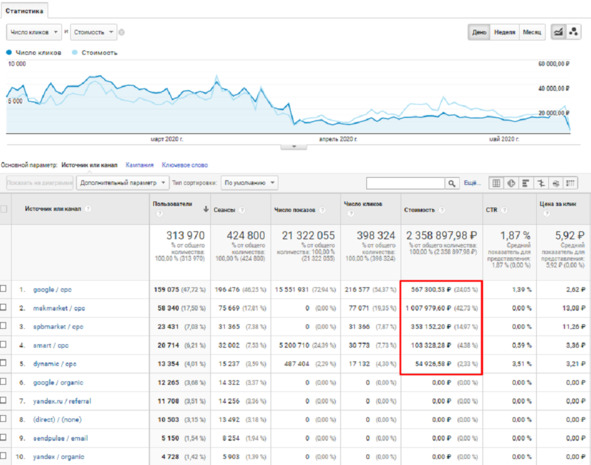 Недостатком является ограничение, установленное рекламными системами, а также особенности работы Google Analytics. Например, при использовании Яндекс. Директа, данные о смарт-баннерах придется загружать вручную, поскольку затраты на них не передаются автоматически.