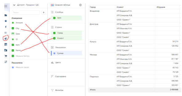 На основе данного датасета мы создадим 3 визуальных компонента – сводную таблицу, а также 2 графика. Для начала сформируем сводную таблицу, где в строках будут указаны города, а также клиенты, а в колонках – категории продуктов. Чтобы добавить нужные поля, просто перетащите их мышью в соответствующие области сводной таблицы.