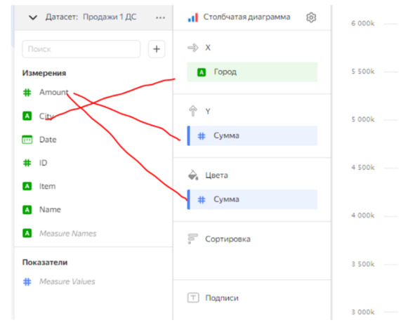 Теперь осталось внести несколько изменений, чтобы скорректировать названия заголовков, а также отображение сумм без копеек. 1 таблица уже готова. Сейчас давайте создадим график, который будет показывать динамику продаж по населенным пунктам. Снова перетащим необходимые поля в соответствующие разделы, а также зададим заголовки для графика.