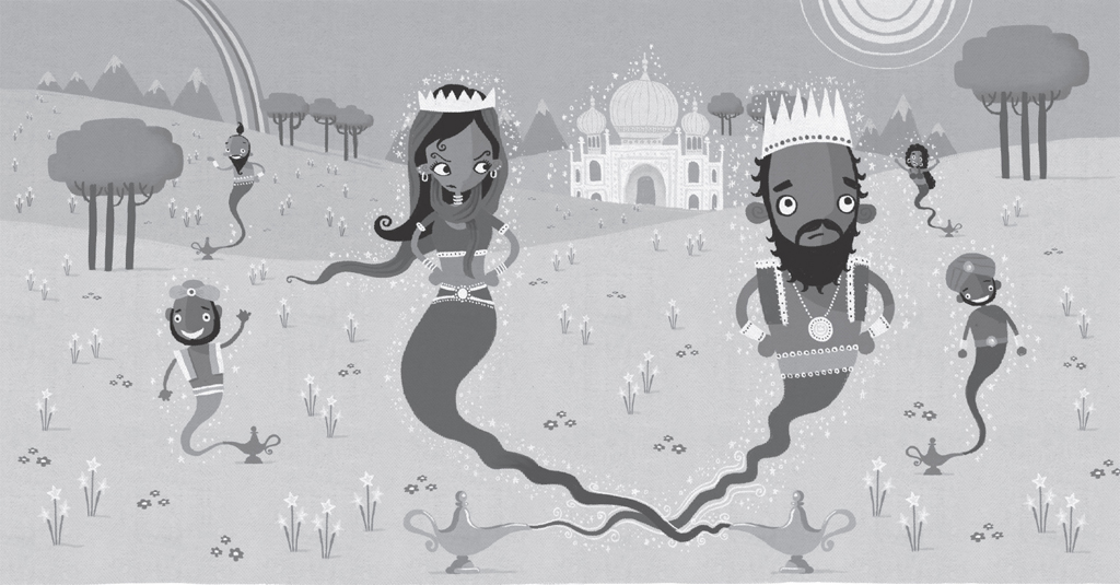 ‘That does it!’ said the Genie King. ‘Lamp duty for you, you rascal! One thousand years of service to a lamp.’ He turned to the Queen. ‘How’s that, my dear?’
