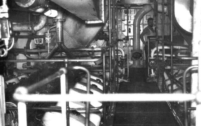 Meiler zog sich einen Kesselanzug an und stieg in den Maschinenraum hinunter. Wie ein gewaltiger, ruhig und behäbig liegender vierkantiger Felsblock nahm der Hauptmotor den größten Platz ein. Seine Kraft, jetzt ruhend und auch schlafend, betrug mehrere Tausend Pferdestärken. Blankblitzende Treppengeländer! Weißlackierte Maschinenraumschotten glänzten im Lack und im Licht von hochkerzigen Lampen. Wohlige Wärme. Dieselölgeruch! Zum Trocknen aufgehängtes Arbeitszeug! Das Wummern und Tumben des Hafendiesels!