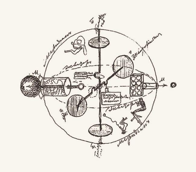 Константин Циолковский. Работа космонавтов на борту корабля. Рисунок из рукописи «Свободное пространство», 1883