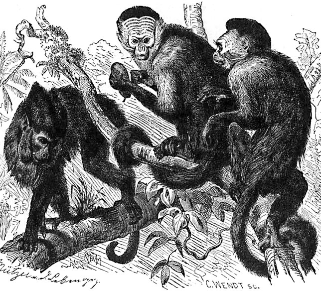 Четвертый род цепкохвостых обезьян – сапажу (Cebus), отличаются тем, что хвост у них хотя и может обвиваться вокруг древесных ветвей, но не служит органом хватания; кроме того, он со всех сторон покрыт волосами, тогда как у ревунов он обнажен на конце с нижней стороны. Сапажу – довольно пропорциональны; теменная часть их головы округлена; руки – средней длины; мех – густой и короткий.