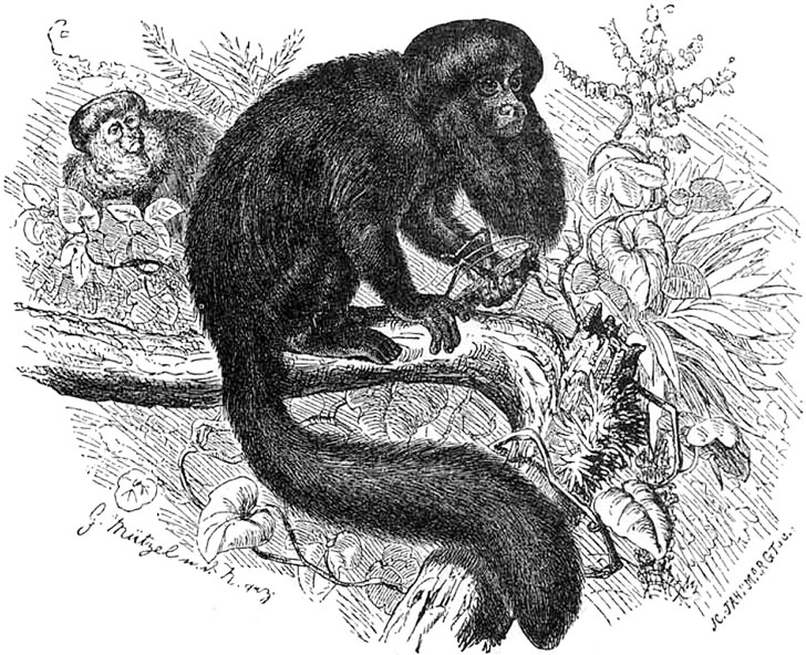 Другой род, Ateles, – цепкие обезьяны справедливо получили за свою оригинальную фигуру название паукообразных. Действительно, голова у них маленькая, конечности необычайно длинные, тело худое, лицо безбородое, отечеством их служит Южная Америка до 25° ю. ш., а местопребыванием – вершины самых высоких деревьев; живут стадами в 10–12 штук, иногда же – парами. Виды их мало отличаются друг от друга.