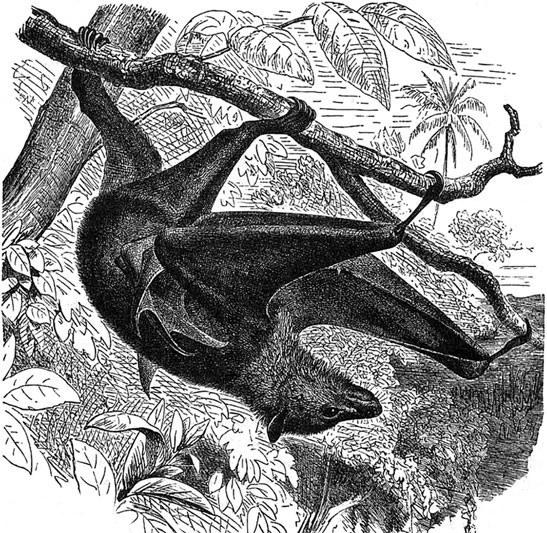 Чтобы легче было развернуть для своего полета летательную перепонку, все рукокрылые во время отдыха прицепляются когтями задних конечностей к какому-нибудь возвышенному предмету и свешиваются головой вниз.