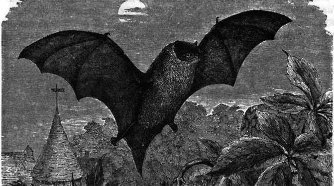 «Он лег спать в большой комнате одного дома при открытых окнах. Среди ночи в комнату влетел огромный вампир. Путешественник еще не спал, но остался совершенно неподвижен и ждал, что будет делать летучая мышь. Сначала последняя тихо облетела всю комнату. Сделав это несколько раз, она стала виться взад и вперед между потолком и спящим. Мало-помалу она опускалась все ниже и ниже, наконец совсем опустилась на него, быстро махая крыльями. Таким маханием она приятно обвевала свою жертву. По словам рассказчика, путешественник и сам не заметил, как отвратительное животное впилось ему в открытую грудь. Все это произошло без малейшей боли и сопровождалось приятным обмахиванием крыльев. Наконец, по прошествии некоторого времени, он стал ощущать боль, не вытерпел и своими руками задушил вампира».