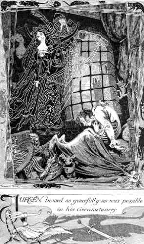 Все трое слыли бывалыми пьяницами, так что Юрген лег в постель, изрядно набравшись, готовый к чему угодно. Позднее он сел в постели и обнаружил, что все происходит именно так, как он и подозревал. Комнату посетили духи, и у изножья его ложа находились два призрака: один – нахальный на вид, искоса поглядывавший фантом в старомодных доспехах, а с ним – прекрасная бледная дама в ниспадающей складками белой одежде.