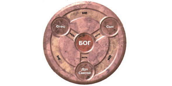 Церковная диаграмма для объяснения Троицы: Отец и Сын, и Святой Дух – один Бог, а не три имени одной и той же Личности. Личности отличны друг от друга: Отец – не Сын, Сын – не Святой Дух, а Святой Дух – не Отец.